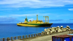 船は東京都港区海岸にある「竹芝桟橋」から出港しており、三宅島までは片道約6時間半(竹芝出発22:30~三宅島到着5:00)、「橘丸(たちばなまる)」か「さるびあ丸」の大型客船が1日1往復就航しており、「竹芝桟橋→三宅島→御蔵島→八丈島→御蔵島→三宅島→竹芝桟橋」の経路で就航してます。三宅島に着く港は「錆が浜(さびがはま)」、「三池(みいけ)」、「伊ヶ谷(いがや)」と三か所あります。昔は「伊ヶ谷」がなく二か所だけでしたので、海が荒れている時は条件付きという形で出航し、三宅島に着岸できなければ八丈島まで流されてしまいました。今でも流される時も少なからずあります。
