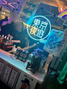 発電機は、会場の賑わいの裏側で、ブースのテーブル下にコンパクトに設置されていました。多くの人が行き交う中でも、弊社の「IEG2800M」は静音性が高いため、イベントの妨げになることは全くありませんでした。日が落ちて暗くなった後も、発電機の電力で照らされた看板や音響機器のおかげで、会場は活気に満ちていました。
